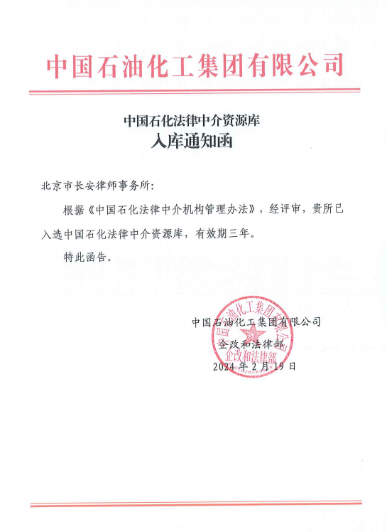 近日,经中国石油化工集团专家严格评审,乐盈welcome成功入选中国石油化工集团有限公司法律中介资源库,有效期三年。本次入库项目得力于我所汪中、赵东锋、焦艳等多位具有丰富法律服务实战经验的骨干律师团队的力量支持。