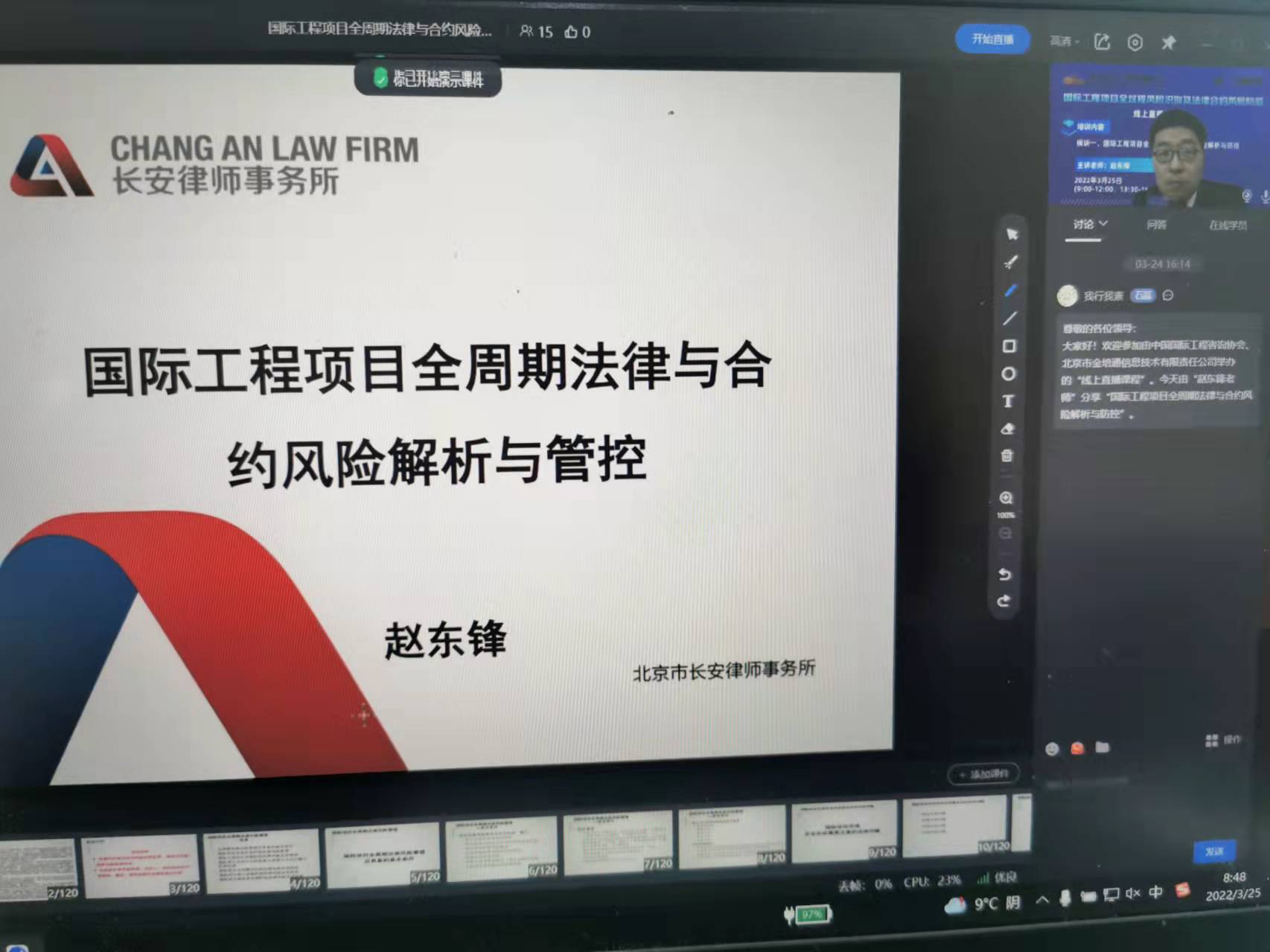 2022年3月25日,乐盈welcome高级合伙人赵东锋律师受中国国际工程咨询协会的邀请,为其组织的“国际工程全过程风险防范及法律合约风险防范”线上直播培训项目讲授《国际工程全周期法律与合约风险解析与防控》课程。