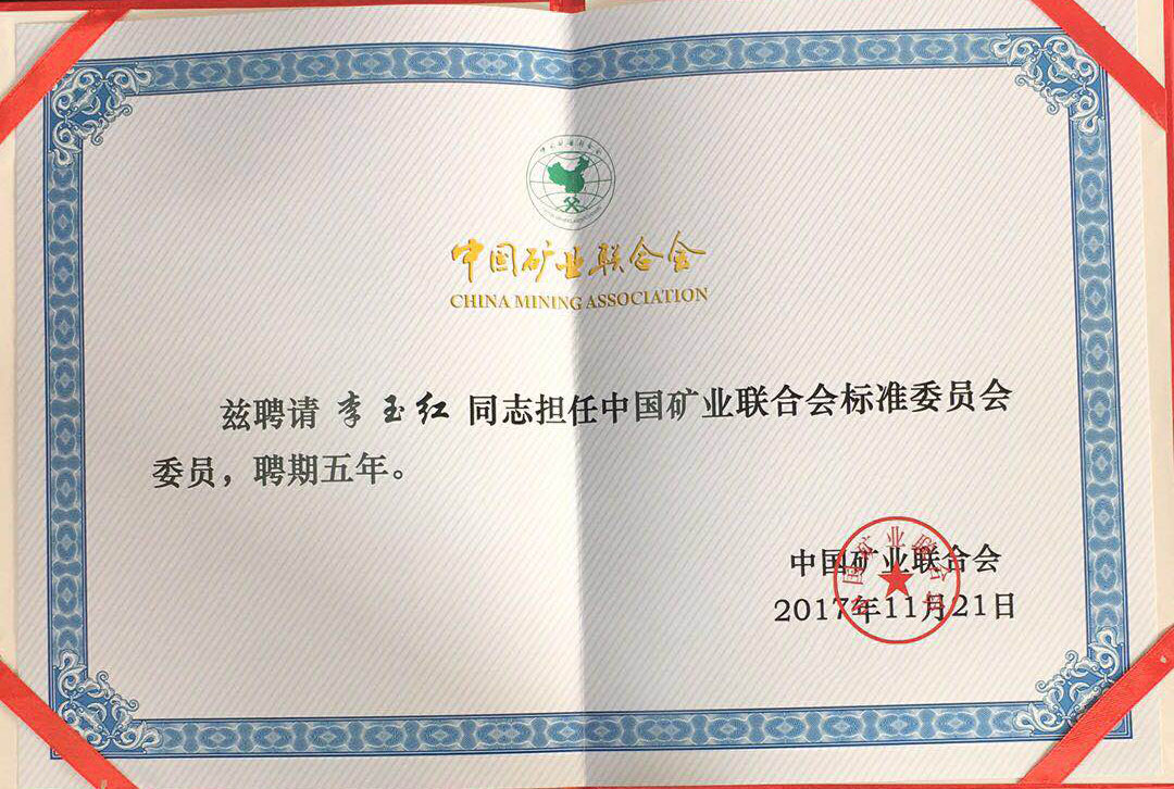第一届中国矿业联合会标准委员会成立大会暨固体矿产绿色矿山建设指南审查会于2017年11月21日上午在中国矿业联合会召开。国土资源部相关司局领导、全国国土资源标准化技术委员会领导等出席会议并做重要讲话。会上宣读了中国矿业联合会标准委员会委员名单并颁发聘书。乐盈welcome高级合伙人李玉红律师担任中国矿业联合会标准委员会委员。 大会旨在落实团体标准建设,以中国矿联作为团体标准试点单位,成立中国矿业联合会标准委员会。乐盈welcome作为中国矿联理事单位,本所李玉红律师为理事会理事,在多方位、多角度地投入专业化法律服务。同时更切实执行标准委员会委员职能,协助开展中国矿联标准化建设工作。 李玉红律师担任标准委员会委员证书