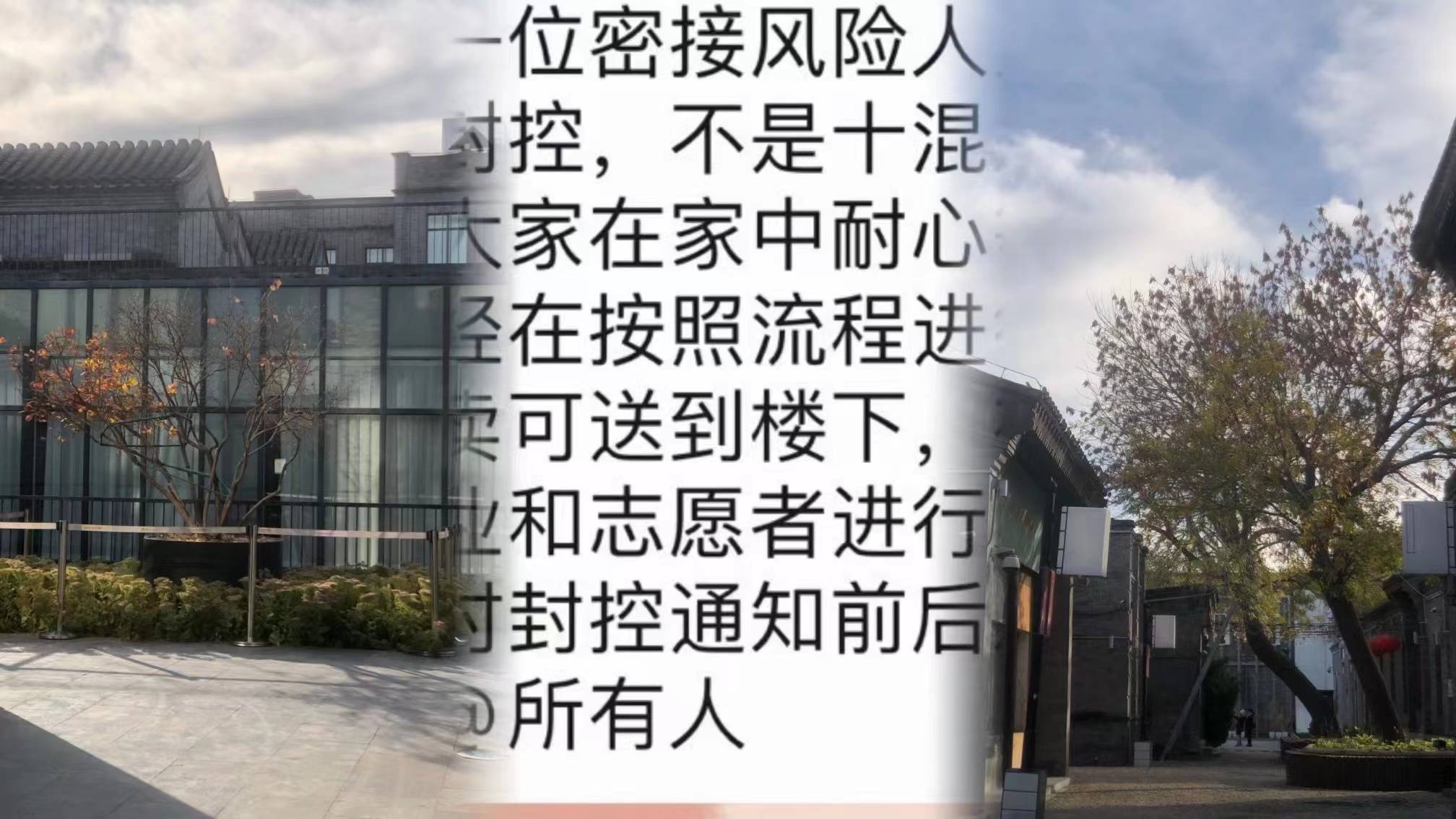 时间倒回至20221115日,一个普通的日历日。习惯养成早起,七点半就出门到办公室。因为近期北京的YQ状况有点趋紧,就习惯性地看看社区防疫群里的消息。突然发现有人发了一张照片,自己居住的楼宇大门口被放了红白相间的围栏(应该不用多描述,疫情以来这样的场景随时可见)。同时看到SJ留言“本楼临时风控!”本以为看差了,就把SJ发的留言逐字看了数遍。“难道有Y在这里?”“已经出门的人员该怎么办?”“需要回去,还是等进一步的消息?”脑海中不断闪现一系列的问题。往常没什么热度的防疫群,一时间也都活跃起来,大家纷纷抛出疑问,就想寻个确定的答案。热议中,SJ发了一则通知,大致意思就是因为楼里有一位MJ高风险人员,上级JK需要进一步复核,要把楼宇临时封控。“既然是这样只有等,希望能如其他楼一样当天解封”。真是“转角遇不到爱情,可能遇到YQ”!