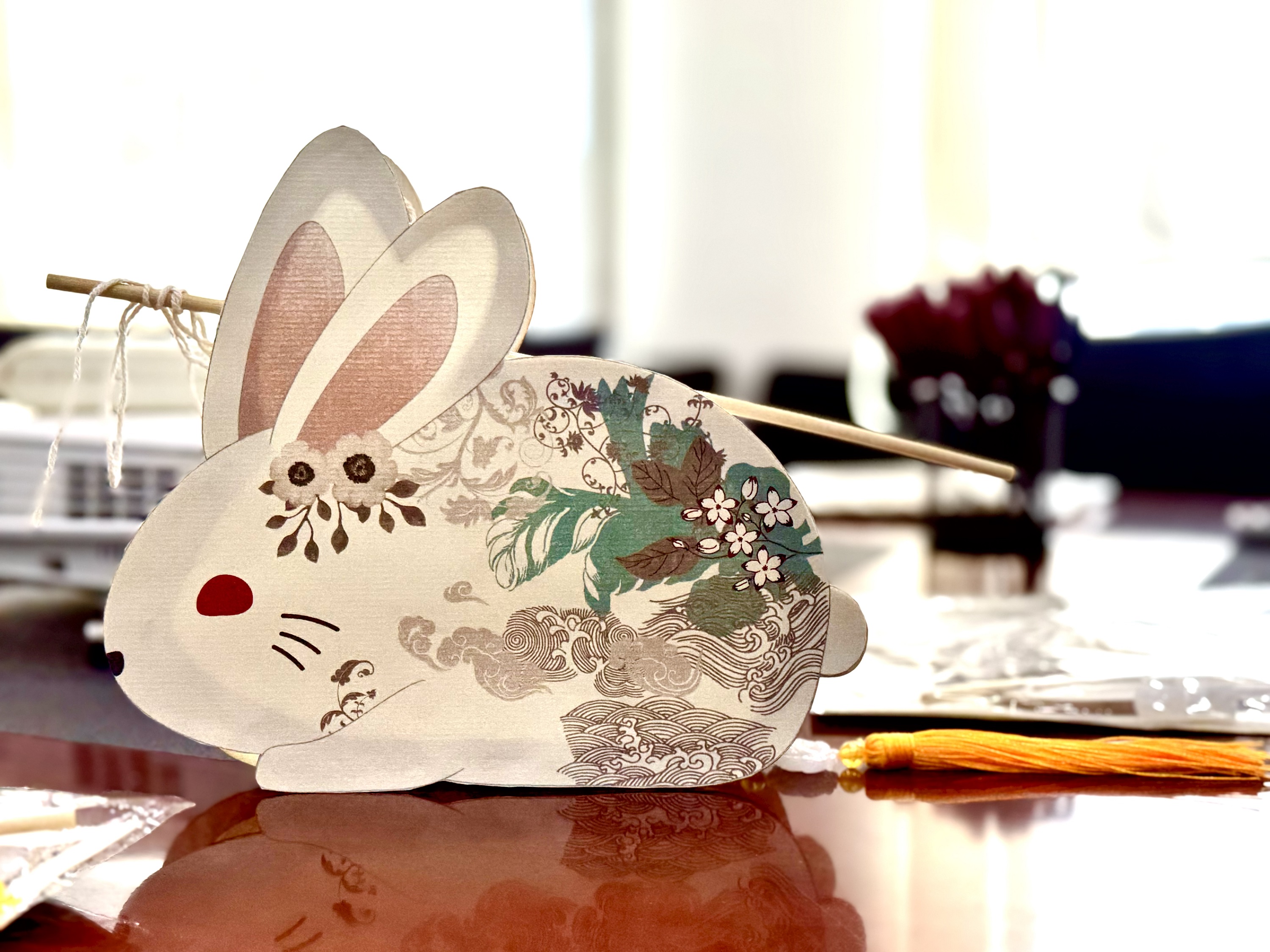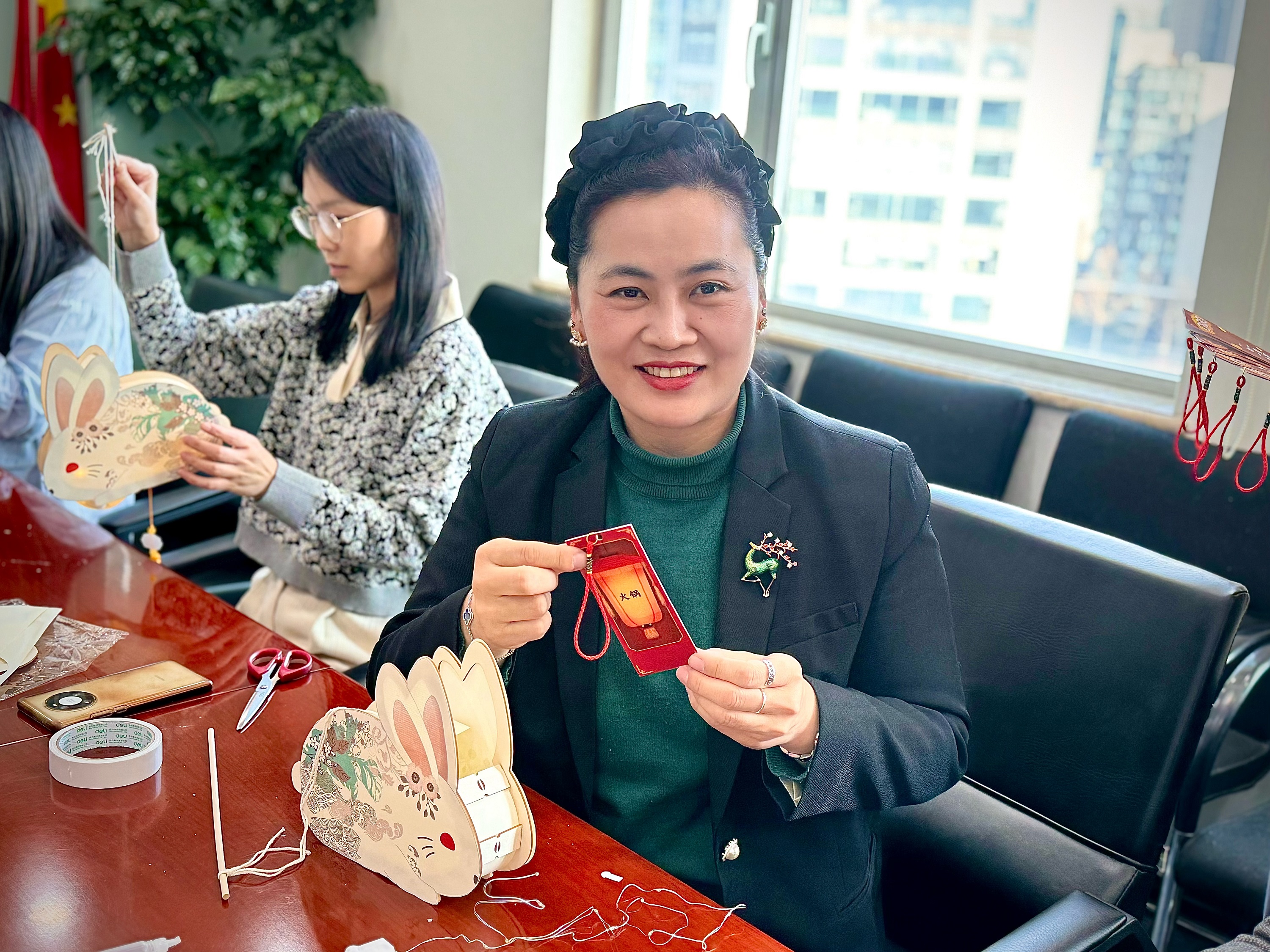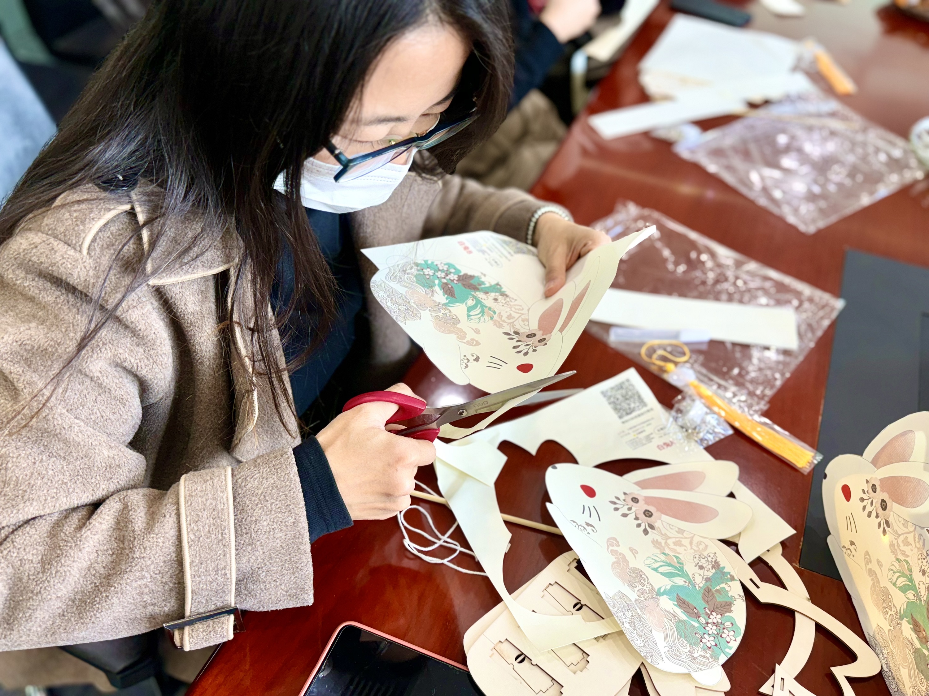 做花灯也是元宵节的重要习俗之一。亲手制作一盏花灯,不但可以增添节日氛围,也有祈祷平安之意。律师们用纸板、框架、线绳等材料组装成灯体,并安装上小灯,一盏盏兔子灯笼相继点亮。