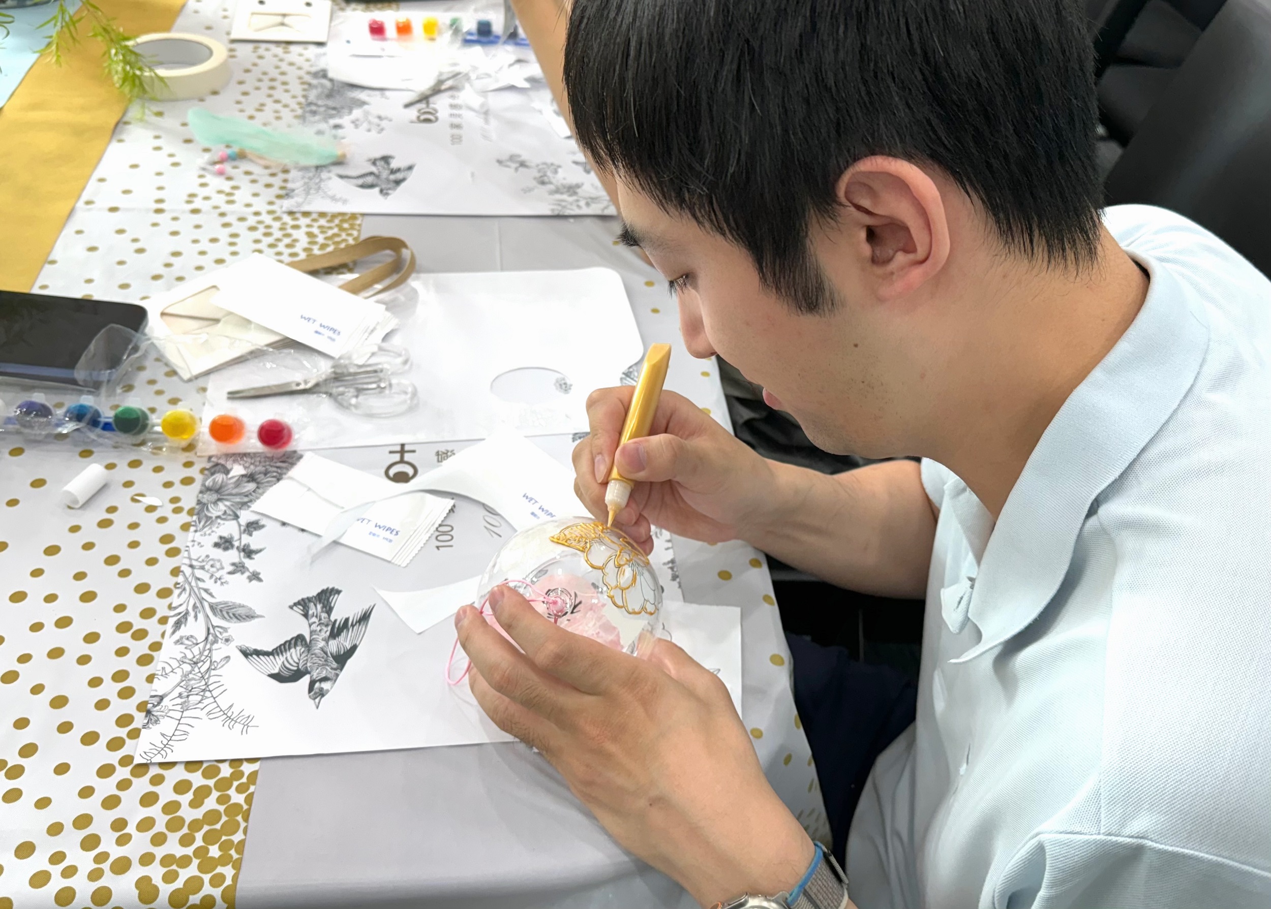活动中,律师们在老师的引导下,用勾线笔描绘出图案的轮廓,待晾干后进行填色,最后挑选羽毛、贝壳、捕梦网等饰品悬挂在玻璃画下方。步骤虽不算繁杂,但每一步都需精雕细琢。制作完成后,轻轻摇晃手中的风铃就可听到清脆悦耳的声音。律师们享受着手工项目带来的乐趣,每一份风铃的色彩和纹理都体现了作品独特的风格。