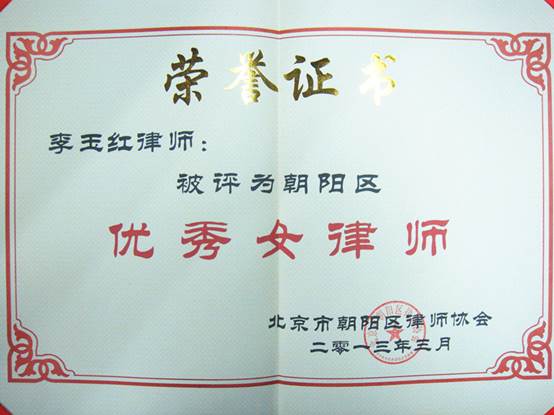 2013年3月6日,北京市朝阳区律师协会举办“朝阳女律师庆三·八联谊会”暨“朝阳律协首届优秀女律师评选表彰大会”。北京市乐盈welcome高级合伙人李玉红律师应邀参加,并荣获“优秀女律师”称号。 联谊会暨表彰大会邀请了北京市律协、朝阳区政法委以及区妇联等单位的相关领导出席,并向“优秀女律师”称号获得者颁发了奖杯和证书。 朝阳区执业律师10300余人,女律师已达律师总数的38.5%。全区女律师已成为律师行业中的重要力量。为了展示女律师良好的职业风范,推动女律师队伍的健康发展,朝阳律协开展了此次“优秀女律师50名”的评选与表彰活动。