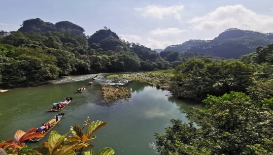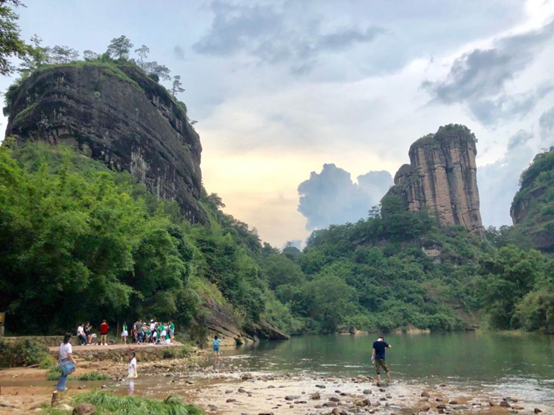 第三天我们来到九曲溪,坐着竹筏顺流而下,观赏河两岸的美景。九曲溪发源于森林茂密的武夷山自然保护区,全长62.8公里。进入风景区的一段河流除受河流自然弯曲的作用之外,还受多组岩层断裂方向控制,形成深切河渠,使9.5公里长的河流,直线距离仅5公里,我们主要就是游历这段河道。比起昨天的炎热,坐在竹筏上凉爽了很多!吹着凉凉的风,竹筏激起的浪花,船工介绍着沿途的美景,时不时还有山猴在水边嬉戏,美不胜收的风景让我们大饱眼福!中午突然下起的倾盆大雨让我们又惊又喜,天气一下凉爽了许多。下午我们到达了一线天景区,一线天让我感到“惊艳”,石路很狭窄并且越走越窄,洞中又潮湿,但是很凉爽,阳光从缝隙中穿射进来,光线忽明忽暗,时不时还有几只蝙蝠在头顶盘旋,喜欢冒险的人绝对值得一试!晚上在风景宜人的仙店农庄用餐,湖畔几座小楼,边吃边看风景,十分自在!
