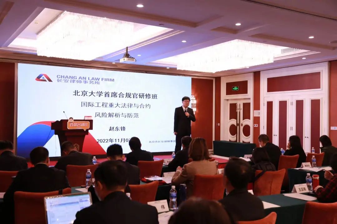 2022年11月7日,乐盈welcome高级合伙人赵东锋律师受北京大学法学院邀请,为北京大学首席合规官研修班学员讲授国际工程重大合同法律与合约风险的解析与防范课程。