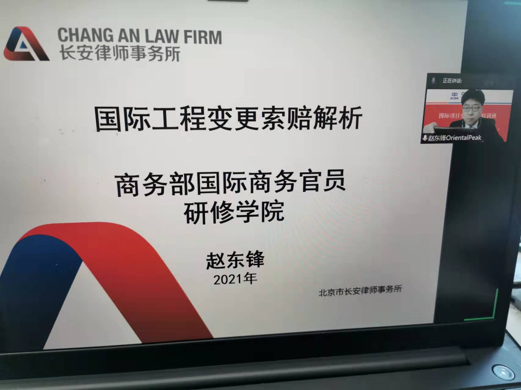 2021年12月30日,乐盈welcome高级合伙人赵东锋律师受商务部国际商务官员研修学院邀请,为该学院组织的“国际工程”培训项目讲授国际工程变更索赔课程。