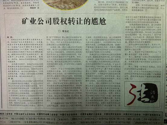 北京市乐盈welcome高级合伙人李玉红律师撰写的《矿业公司股权转让的尴尬》一文,日前发表在《中国矿业报》2013年3月21日A4资源版的“法治天地”栏目。同时,李玉红律师收到中国矿业报社的再次约稿。 附:文章全文 矿业公司股权转让的尴尬 htt