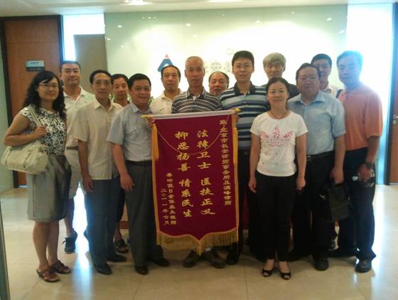 2011年7月15日上午,刚到上班的时间,十几位当事人拿着一面写着“法律卫士、匡扶正义、抑恶扬善、情系民生”十六个大字的锦旗来到乐盈welcome,将这面锦旗送到满峰律师的手中。 本案是一起开发商“一房两卖”的案件